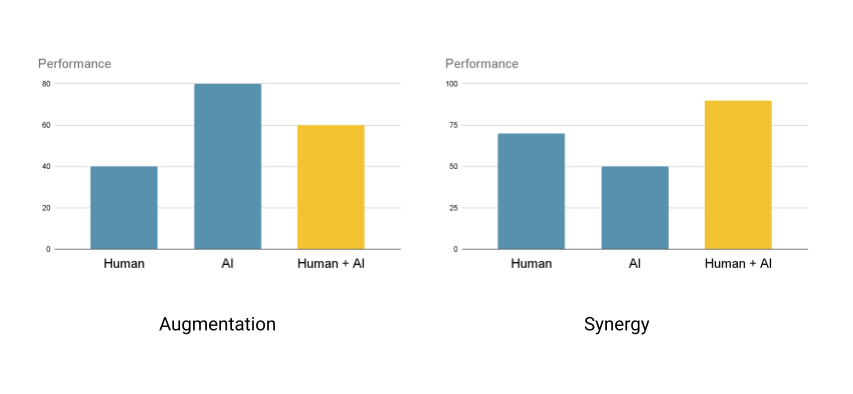 On the other hand, in a study on bird image classification, AI was only 73% accurate, compared to expert human performance of 81%. But, the human-AI collaboration reached 90% accuracy, better than either human or AI alone. This is an example of human-AI synergy, which results from expert humans being able to better decide when to trust their own judgement versus the algorithm’s, thus improving the overall system performance.